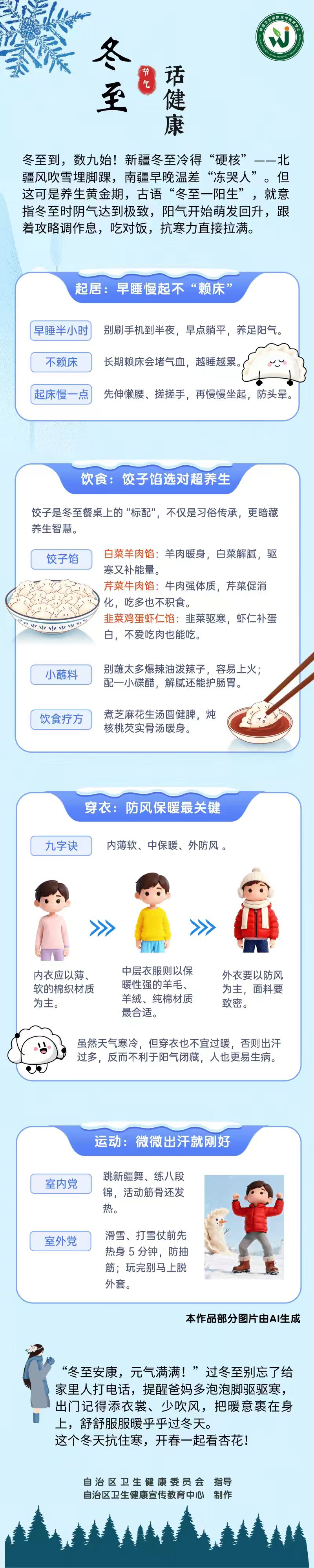 冬至大如年,健康伴冬暖!冬至到,小伙伴们记得多吃温热食物、少贪凉。这份新疆人专属的冬至养生长图干货满满不啰嗦,请收好并转发给家人朋友,大家一起解锁冬至养生正确姿势,平安顺遂过寒冬。