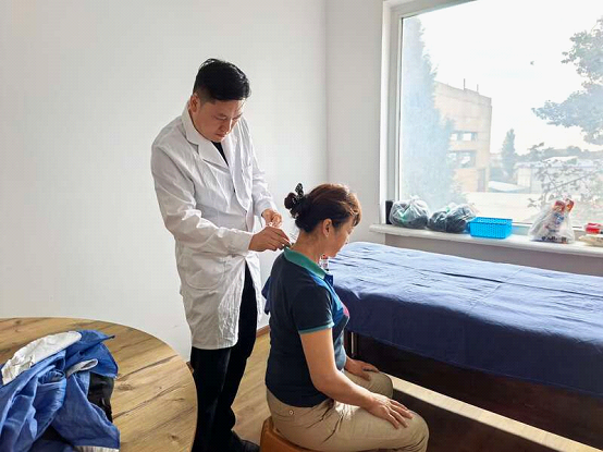 9月16日,格鲁吉亚第比利斯,新疆维吾尔自治区医疗代表团专家为患者施针义诊现场。中国驻格鲁吉亚大使馆供图
