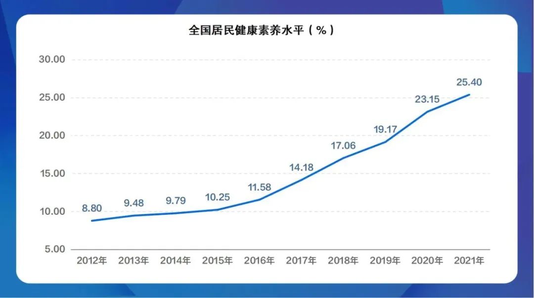 国家卫生健康委从2012年起连续开展全国居民健康素养水平监测工作。每年在31个省(自治区、直辖市)抽取336个县区级监测点开展全国居民健康素养监测,监测内容以《中国公民健康素养--基本知识与技能》为依据,包括基本健康知识和理念、健康生活方式与行为、基本技能三个方面,监测对象为15-69岁常住人口。监测结果显示,我国居民健康素养总体水平继续稳步提升,2021年达到25.40%,比2019年的19.17%提高了6.23个百分点。