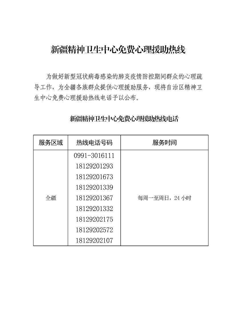 新疆精神卫生中心免费心理援助热线
